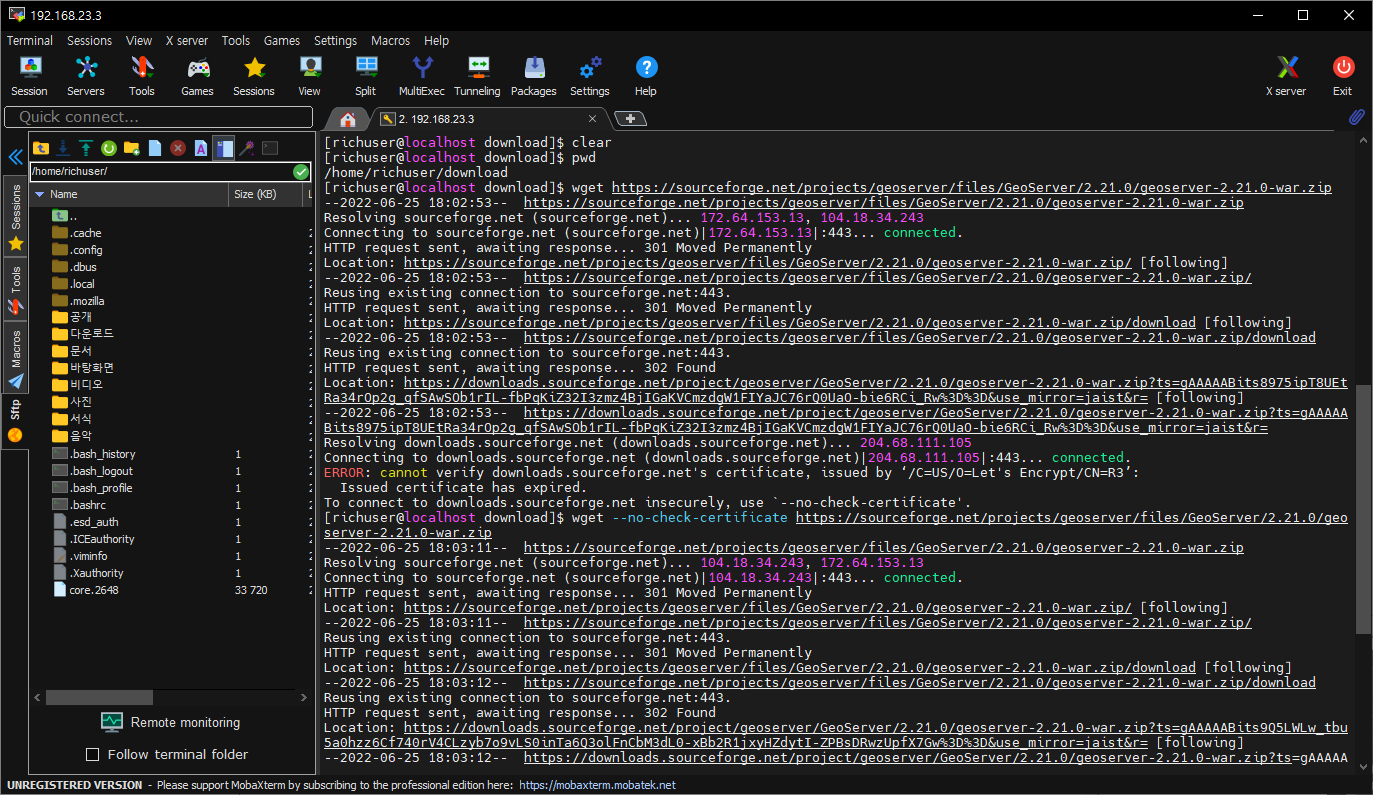 다운로드 받은 파일을 unzip 명령어로 압축해제 하면 geoserver.war 파일이 보인다