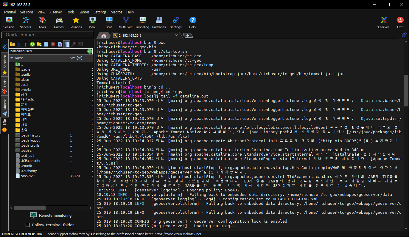 설치된 tomcat 경로의 bin 디렉터리에서 startup.sh 파일을 실행하여 geoserver를 구동