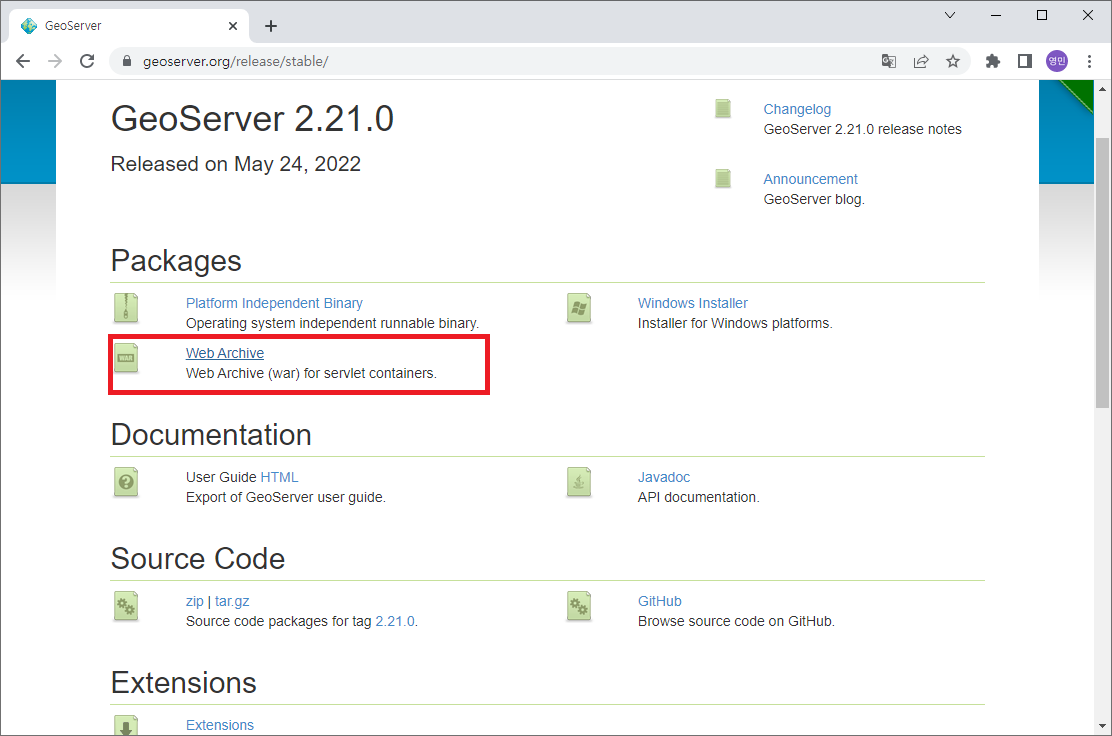 Tomcat으로 geoserver를 구동할 예정이므로 Web Archive 파일을 다운로드 한다,