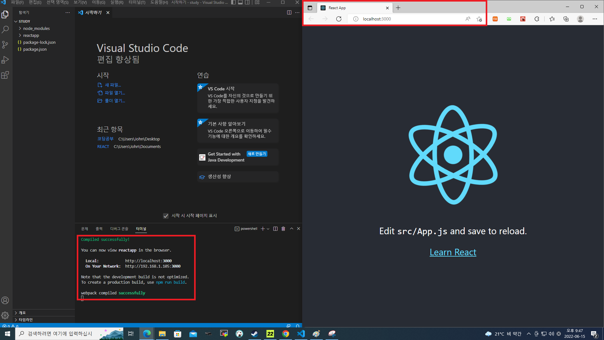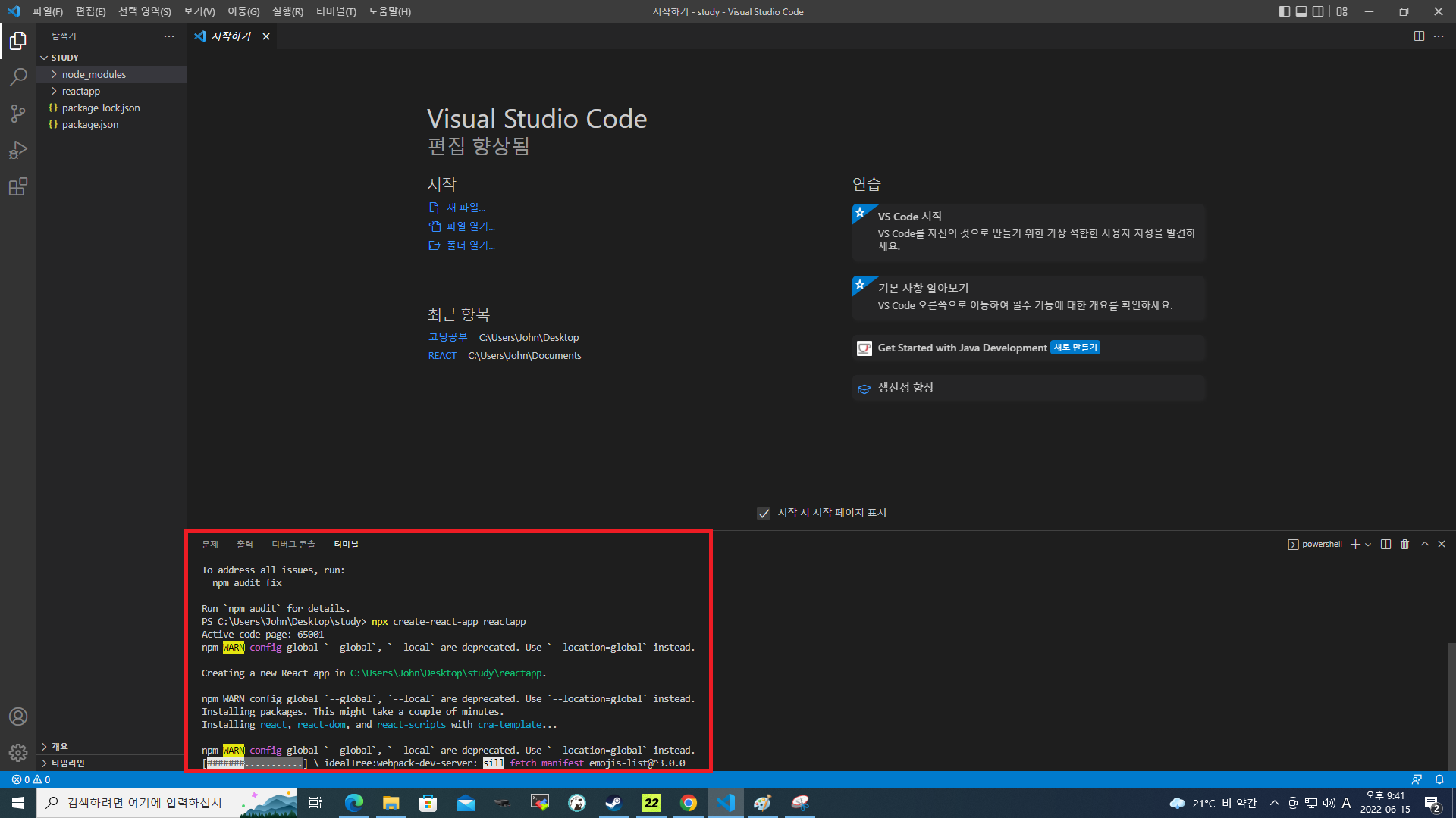 선택한 폴더에 사용할 이름의 폴더가 생성되며 기본 reactapp 파일이 생성됨