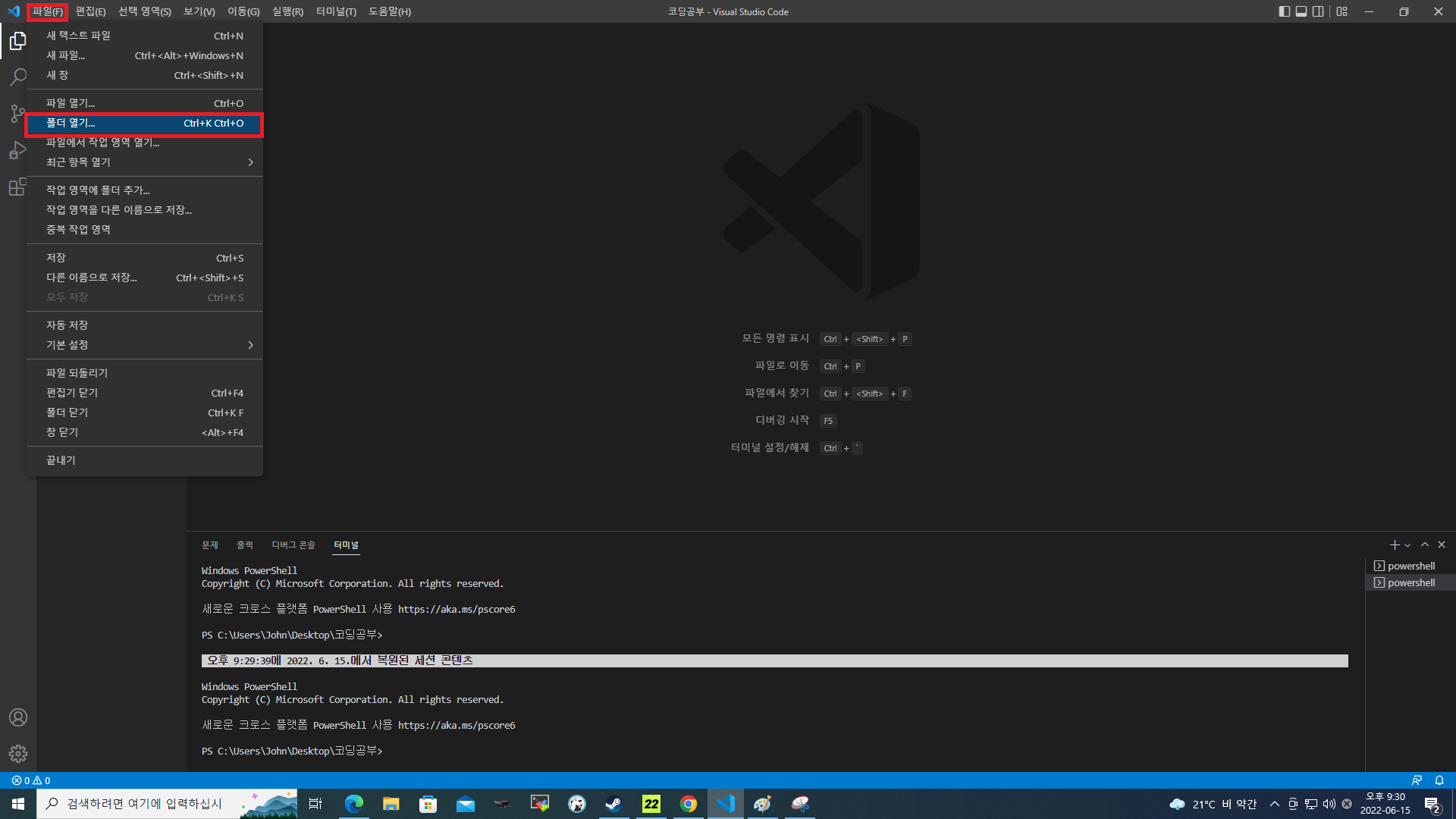상단 메뉴의 터미널 - 새터미널 선택 하여 아래에 터미널 창을 오픈