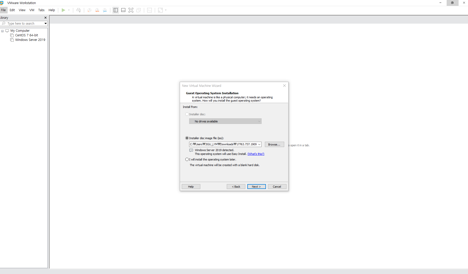 Installer disc image file (iso)를 선택하고 다운로드 받은 CentOS ISO 파일을 선택