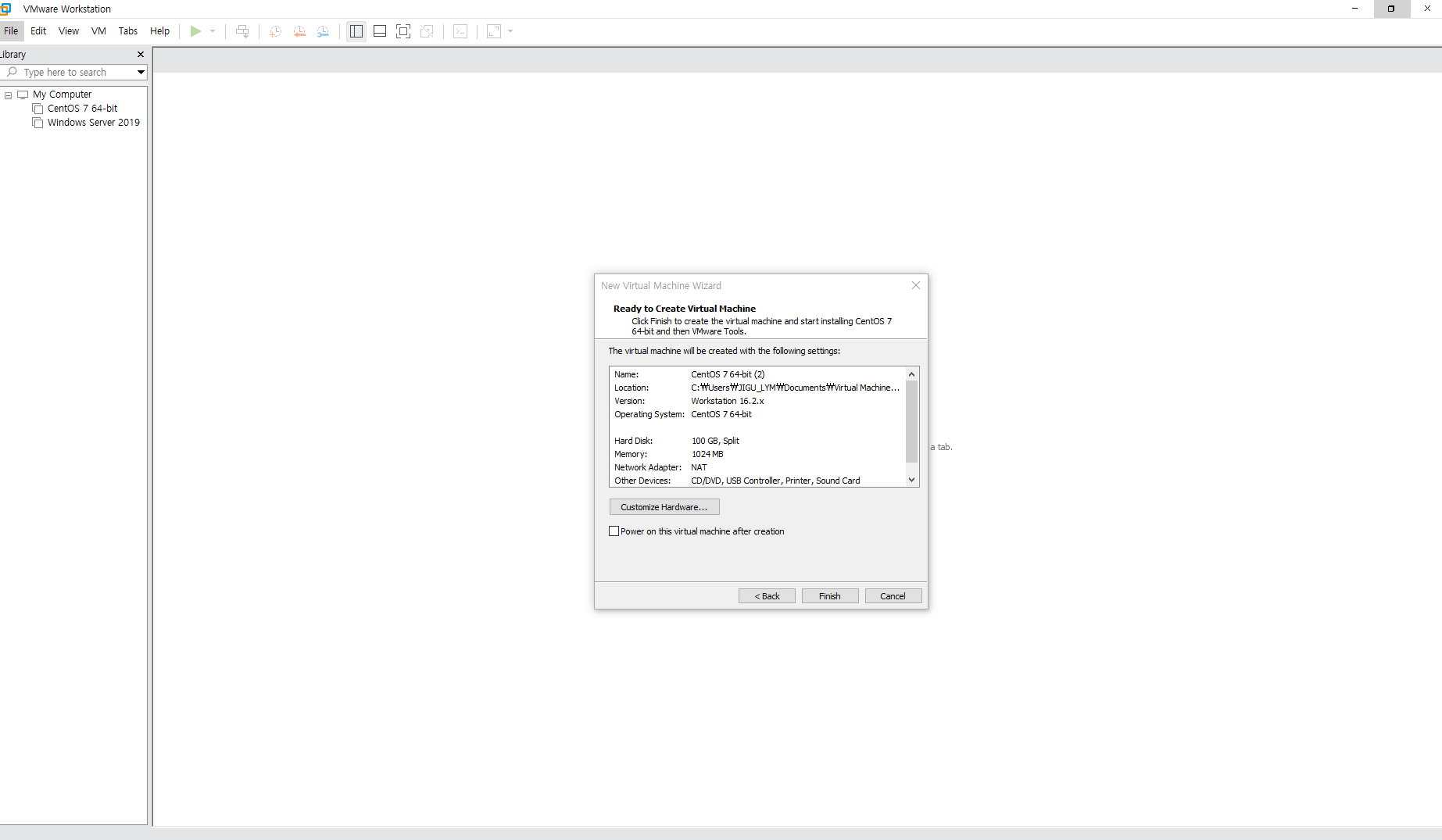 생성할 가상머신의 설정값을 확인 가능... 혹시나 변경할 사항이 있으면 CUSTOMIZE HADWARE... 눌러서 변경 가능!!